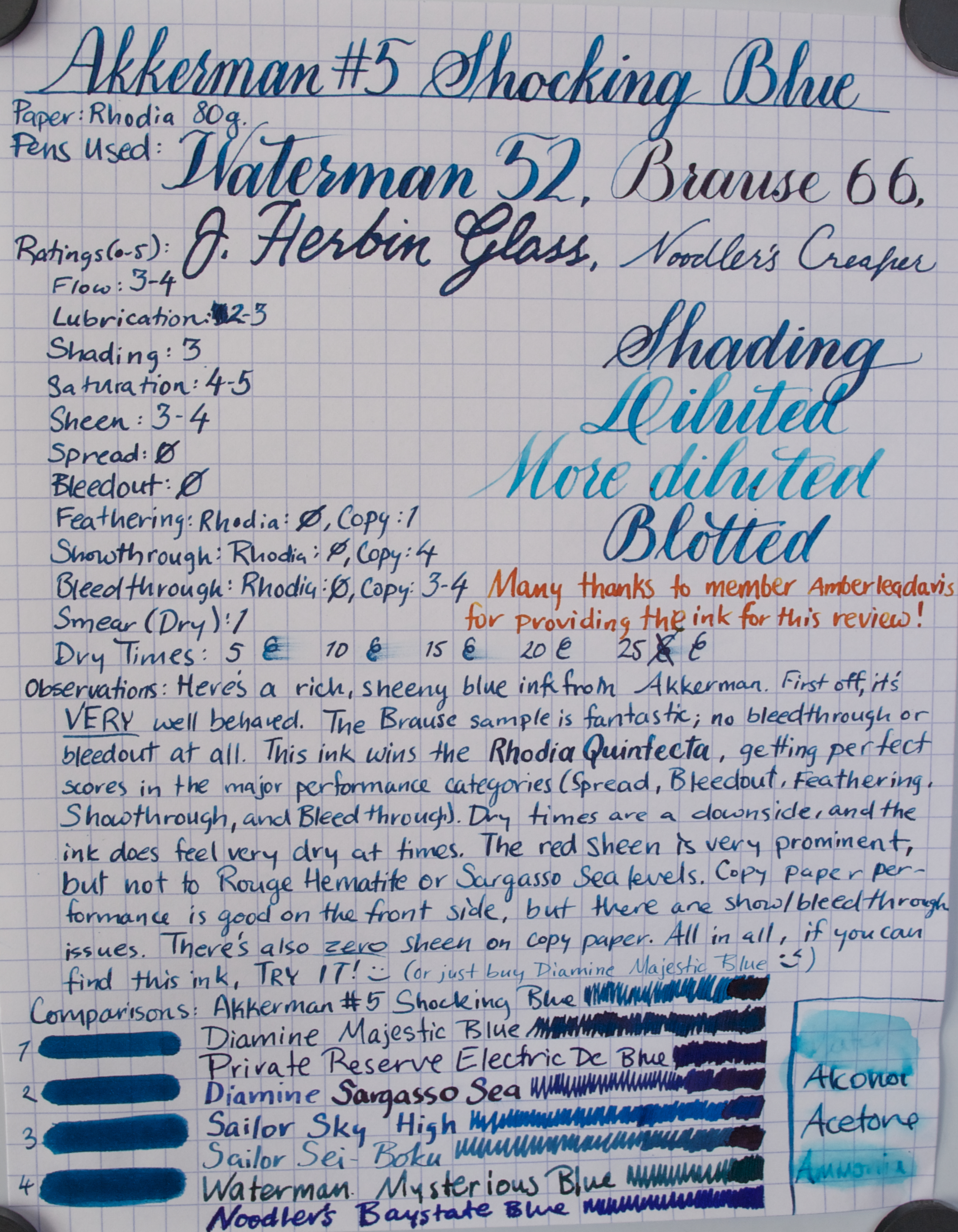 And lastly, the torture tests. Though it fought admirably against acetone and alcohol, it didn’t fair well at all against water and ammonia (and, of course, bleach obliterated it, but that’s hardly uncommon for most inks). The faint writing on the bottom of the page reads “Ten Minute Soak”. Obviously this ink wasn’t meant for Seattle.